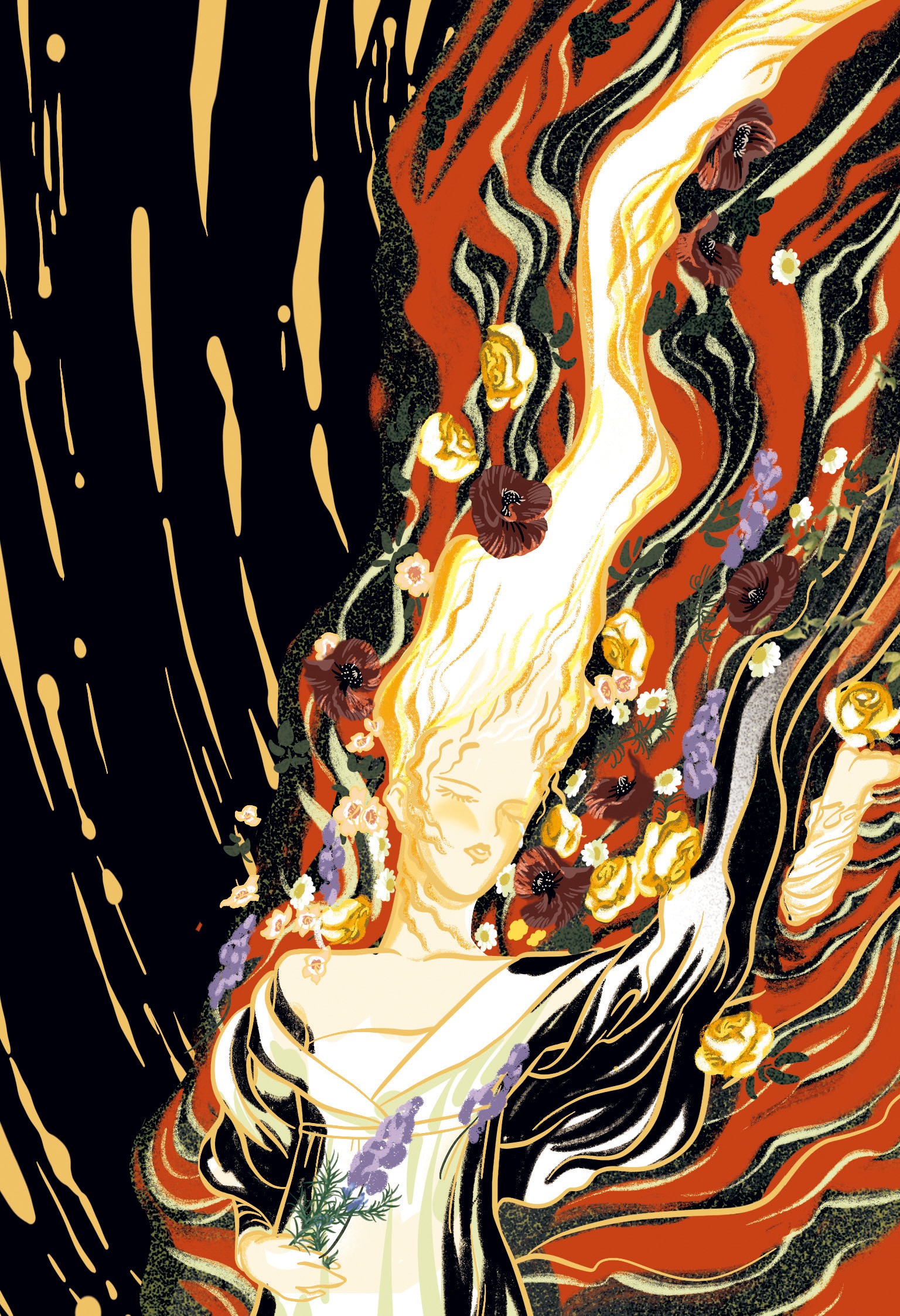 原来那是年轻的奥菲利亚的葬礼。自从波隆尼尔死后,这个可怜的姑娘就神志失常了。她不能接受父亲惨死于自己心上人之手这个事实,整日心神恍惚,在王宫里向其他的女孩抛撒一些假想出来的花朵,说这些花儿是给父亲的葬礼用的。她语无伦次地唱着有关爱情和死亡的歌谣,有时也不知道自己在说些什么,就像完全丧失了记忆一样。在王宫附近的一条小溪旁,生长着一株倾斜的杨柳树,灰白的叶子倒映在如镜的水面上。疯癫的奥菲利亚偷跑到那儿,用金凤花、荨麻、雏菊与紫兰编织了一些绮丽的花圈。当她企图将花圈挂在那枝梢上时,那根摇摇欲坠的枝干折断了。她与花圈一并落入那正在低泣的小溪中。她的衣裳漂散在水面上,使她像人鱼一般漂浮起来。她口中只哼唱着古老的诗歌,好像完全不顾自己的安危,也好像她本来就生长在水中一般。可是,这种情况无法持久,当她的衣裳被溪水浸透之后,这位可怜的姑娘就在婉转的歌声中被卷入流水和泥泞中,死去了。
