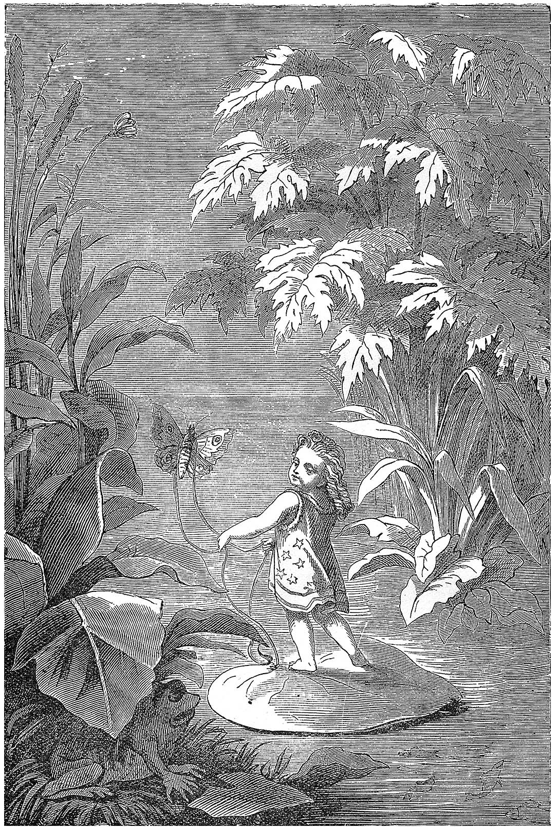一只美丽的小白蝴蝶不停地围绕着她翻飞,最后终于落在了叶子上,因为他是那样的喜欢拇指姑娘;而她呢,也很高兴,因为现在癞蛤蟆再也追不上她了,同时她所漂到的地方又是那样的美丽,太阳照在水面上,就像镀上了一层闪闪发亮的金子。她解下腰带,把一头系在蝴蝶身上,另一头紧紧地拴在叶子上;这样一来,叶子漂得快多了,而且是带着她一起漂,因为她就站在叶子上面。