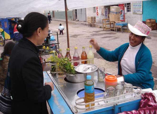 奇瓦伊街上有卖草药茶的,50分索尔一杯。五颜六色的瓶子里泡着不同的草叶。有我在厄瓜多尔认识的路易莎草(hierba luisa),有母菊花(mazanilla),有苜蓿,还有一种是“基努阿”,据说各有各的功效。有点像广东人五花八门的药茶,不同的是由买主自己现点现调兑。