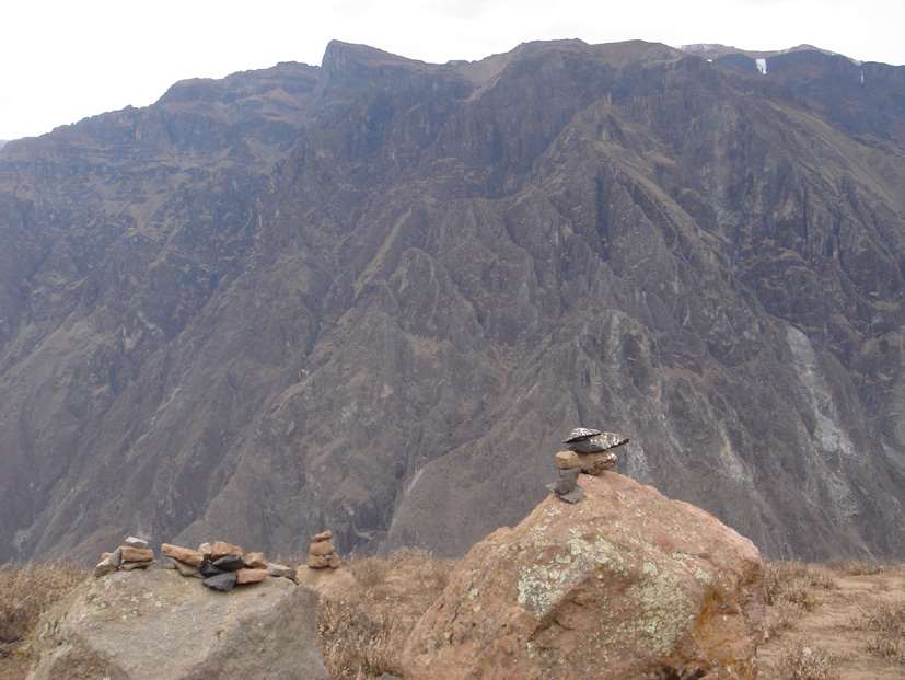 砾石纵横的山头上长着些粗野的仙人掌、剑麻类植物。几块邻近悬崖的大石头上垒着用小石块叠放而成的祭祀堆,像蒙古人的“敖包”。我是在一本怀念切·格瓦拉的书里读到这种习惯的:他的游击队失败后,玻利维亚农民自发为死难者垒起小石堆,因为根据当地人的说法,人会死,雪会化,水会变形,花草会枯败,风吹来又刮走,只有石头永恒,连火也烧不毁。
