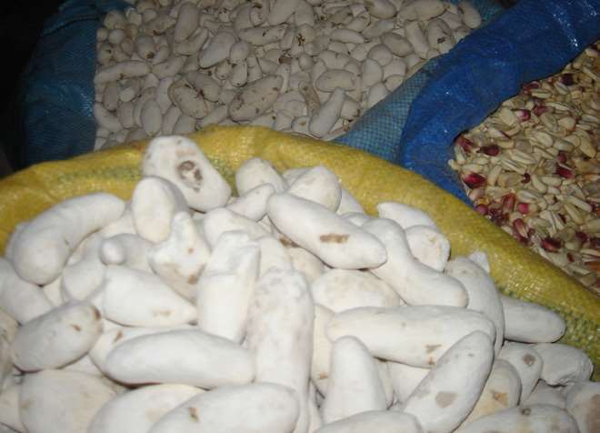 钻进奇瓦伊镇的小农贸市场,大开眼界。不仅看到了五颜六色的玉米,土豆和风干土豆,并增长了一个新知识:风干土豆分两种,黑的才叫“丘纽”,白的则叫“蘑拉亚”(moraya是克丘亚语,它在艾马拉语中的对应词是tunta)。制做“蘑拉亚”与“丘纽”的不同之处在于要挑选优质土豆,经过水煮,因此它色白而甘甜,是比“丘纽”更讲究的风干土豆品种。农民们还颇带点神秘地告诉我们,白风干土豆需要经过一个有明月的晴夜晾冻,“只要一夜,两夜反而不好,我们会看天选择。”。我们还吃惊地看到了新鲜的羊驼肉,卖肉的告诉我们:“祖先靠着风干土豆和新鲜羊驼肉能渡过任何难关。”