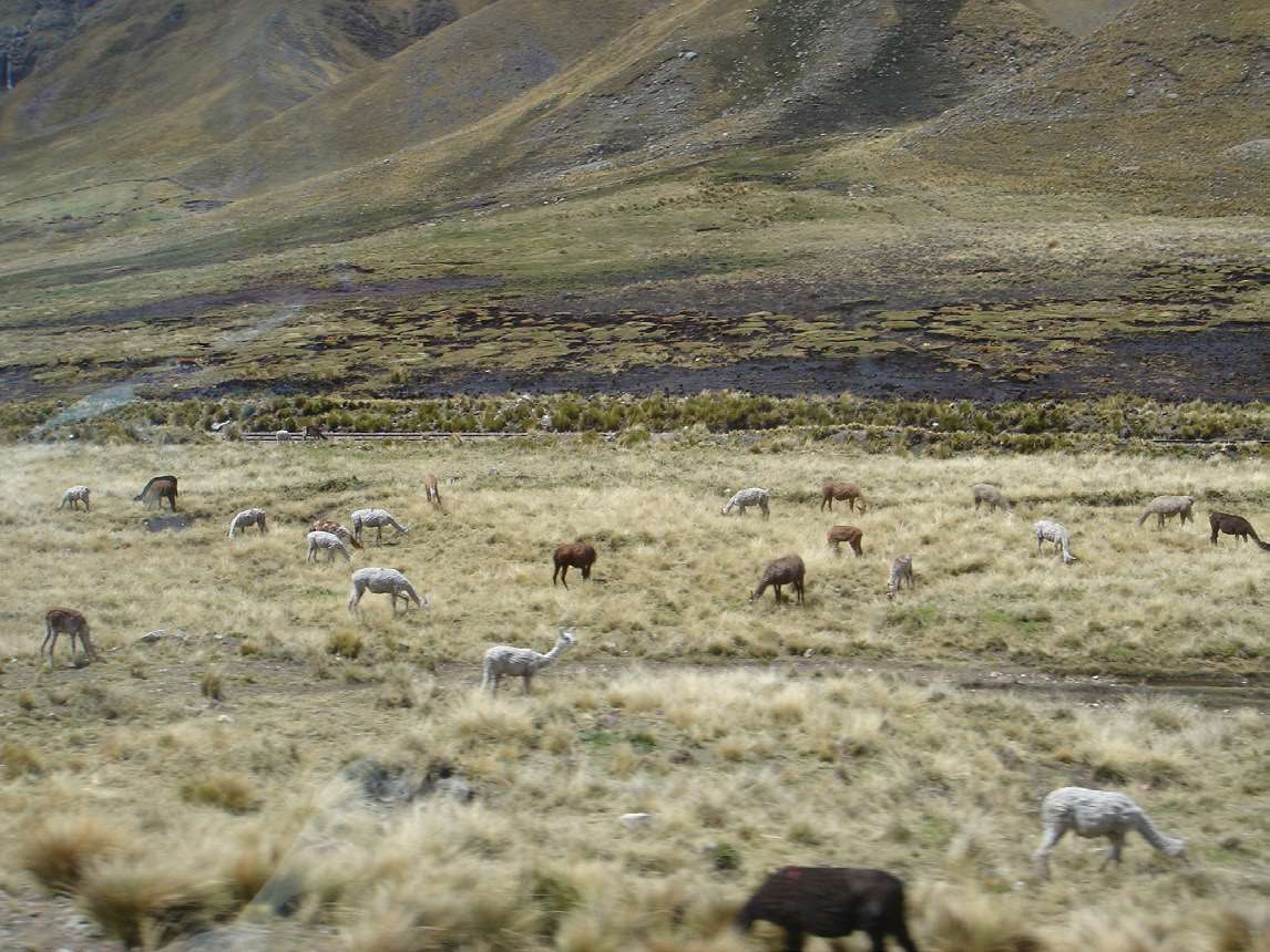 车窗外,高原景色步步浓烈。远处,澄净的空气中雪山巨影不断。眼前,灰褐色的山体一座座扑面而来,前山荒裸的坡地上长着些高寒带的低矮草丛,半球形的蘑菇,似羊似驼的羊驼闪烁其间。无奈班车不为我们停下,隔着车窗,我只能拍下模糊的雪山和羊驼群。