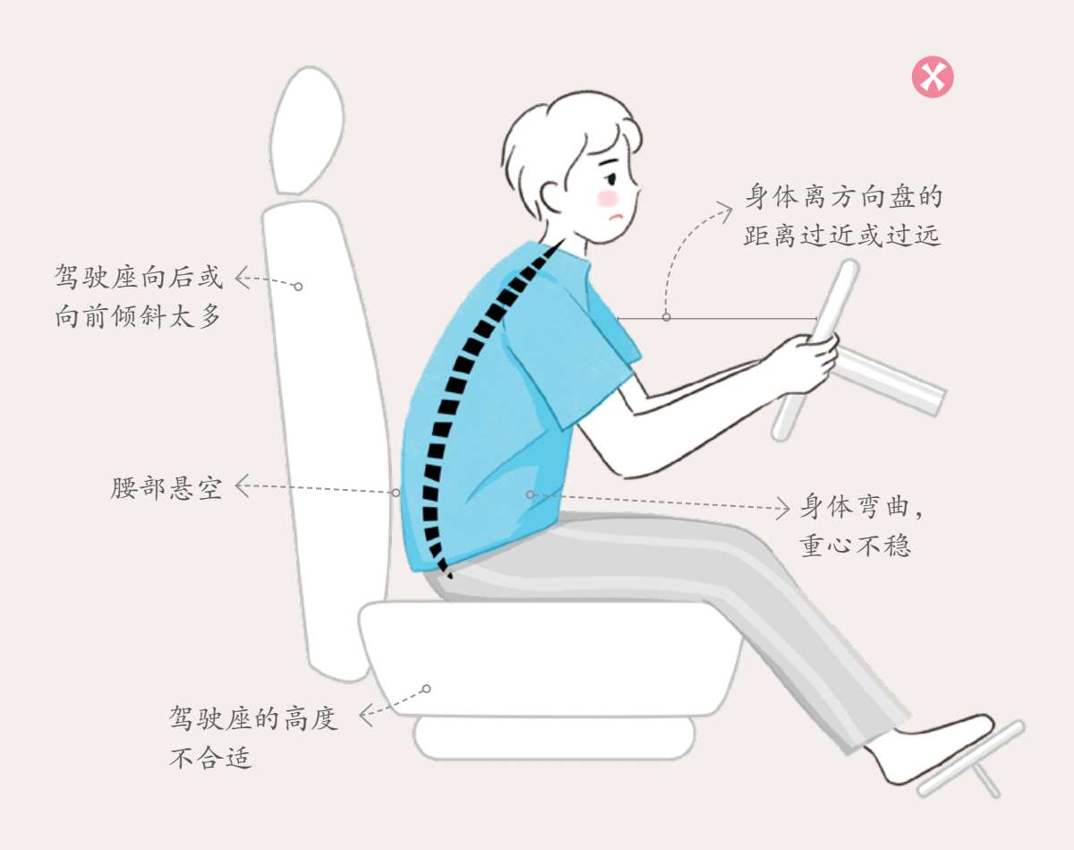 驾驶车辆时,很多不良习惯会对脊柱造成伤害,但却常常被忽视。比如驾驶座的高度、倾斜角度,身体离方向盘的距离,歪着身体开车,腰部悬空等,均会影响脊柱两侧肌肉的协调性。
