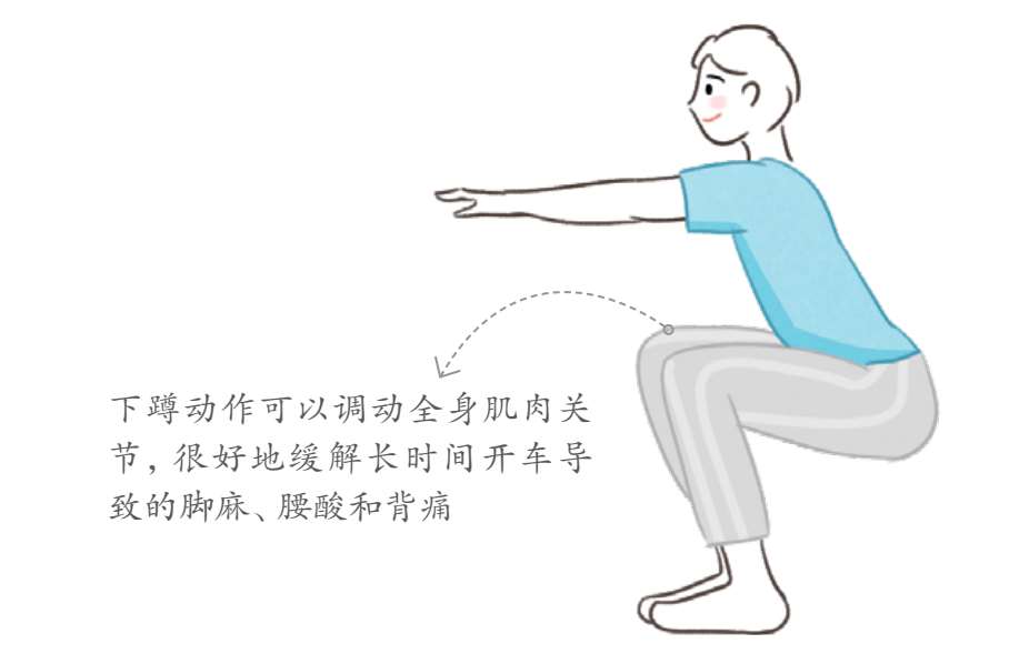 尽量不要长时间驾车,驾车1小时左右最好在加油站或休息区停靠一下,司机下车牵伸一下腰背部,转动一下颈和腰部,做几次下蹲、起立动作,并蹬蹬腿。
