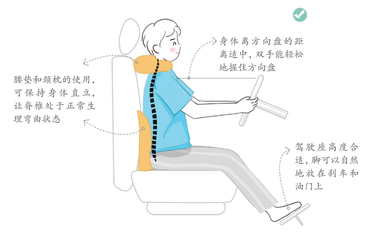 驾车时要自然靠在座椅上,腰部最好加个腰垫,颈部也加个颈枕,使腰椎、颈椎保持前凸的正常生理弯曲。
