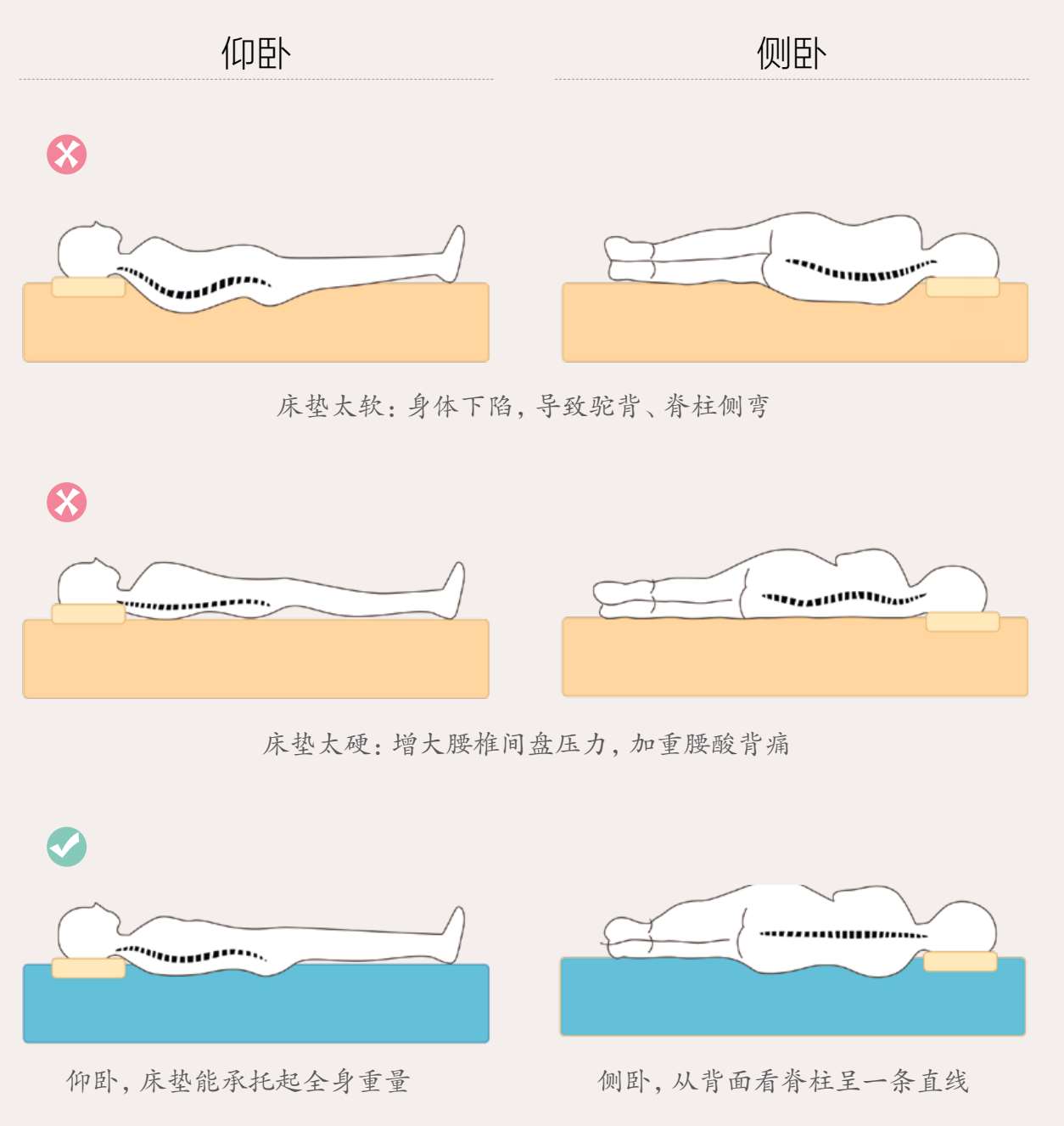 水床太软,承托力不稳定,无法保护入睡时的脊椎,因此容易导致关节错位,引发各种神经症状。那是不是硬床对脊椎更好呢?也不是。事实上,床垫太软或太硬都不好。床垫太软,容易使身体下陷,导致驼背、脊柱侧弯;床垫太硬,会增大腰椎间盘压力,加重腰酸背痛。