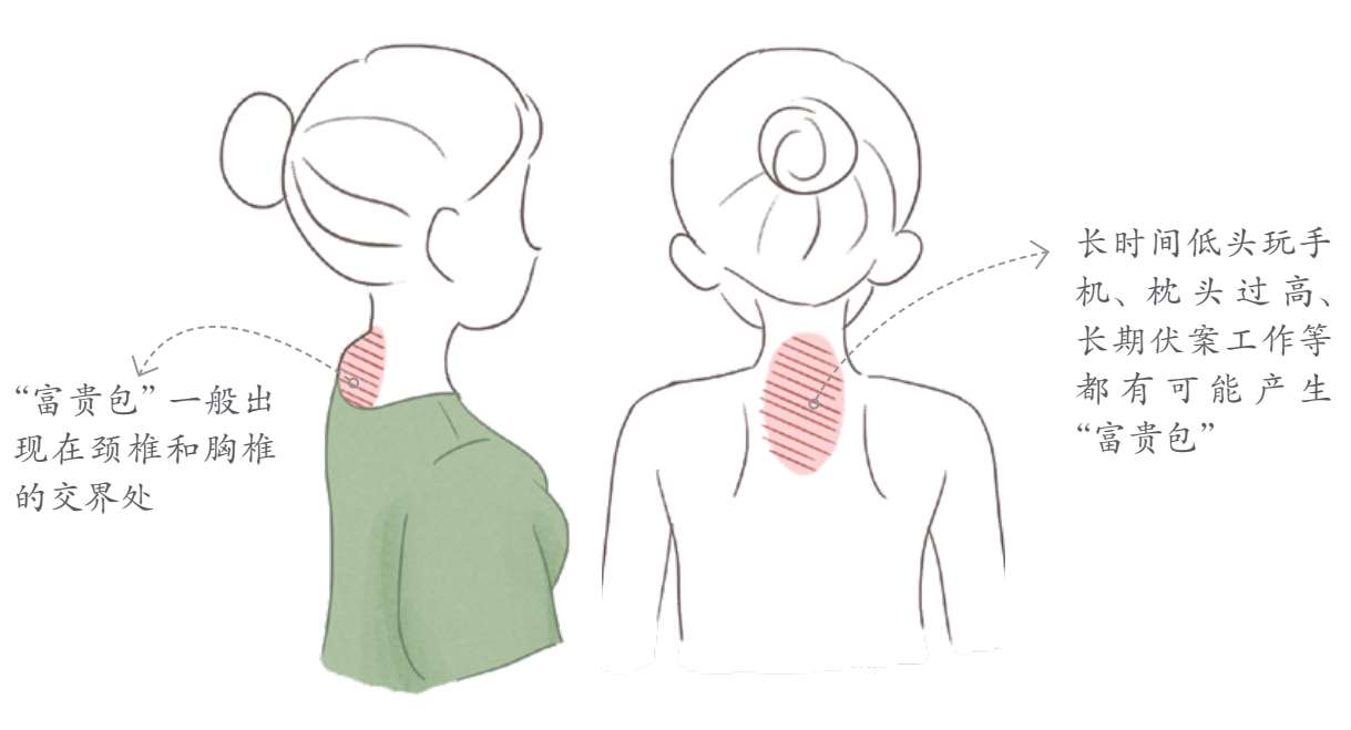 虽然“富贵包”本身无害,但它的形成与肌肉和关节错位有关。低头、含胸、头前倾等不良姿势会使颈部前后两侧的肌肉张力不同。若是颈椎和胸椎发生了错位,局部血液、淋巴循环不畅,造成局部代谢产物和脂肪堆积,就会形成肉眼可见的“富贵包”。需要强调的是,“富贵包”虽然不等于颈椎病,但是会影响颈椎疾病的康复,是颈椎病的预警信号。