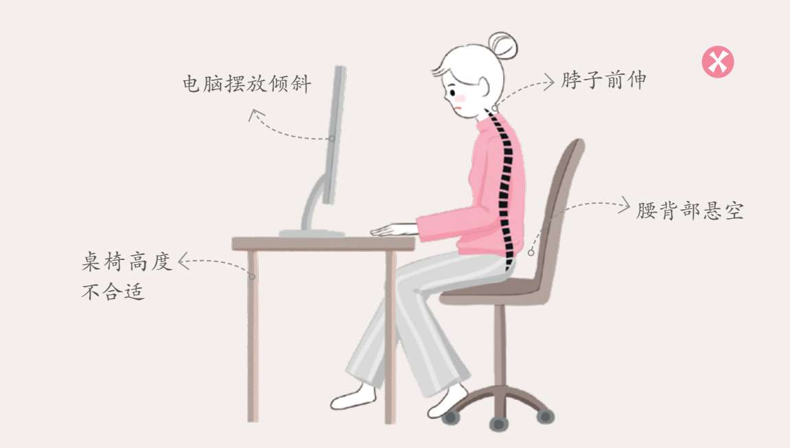 在电脑前工作应坐直上半身,颈部不要向前伸,如果伏案工作,应该是前曲身子,可以低着头,但不要向前伸脖子。
