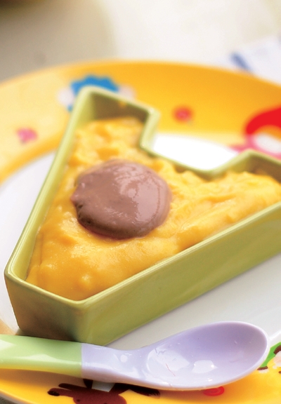 4 猪肝切片后浸泡出血水,蒸熟后放入搅拌机内,加适量温开水搅打成猪肝泥,搭配玉米泥食用即可。