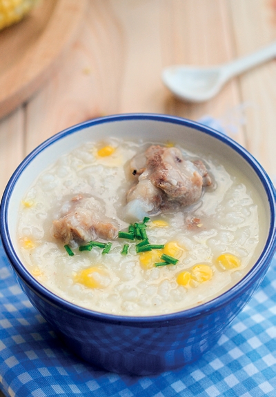 3 锅里放入焯烫好的猪小排,加入足量水,大火煮开后转中小火煮30分钟;加入大米,大火煮开后转小火煮40分钟至米开花、粥变黏稠;再加入玉米粒和姜丝,煮10分钟,最后加盐调味,撒上葱花即可。