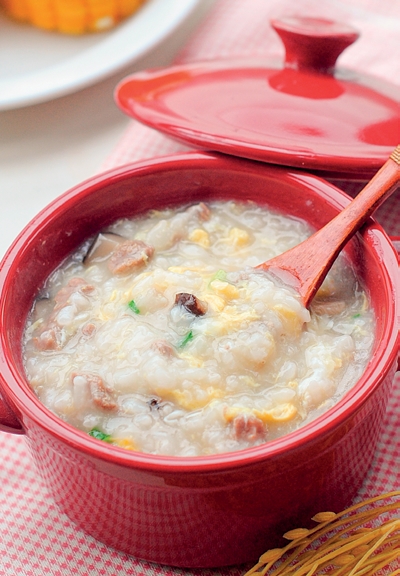 1 大米洗净,放入锅内,加水煮粥;鸡蛋取蛋清备用。