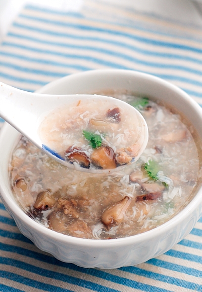 2 锅中加水烧开,加牛肉碎、姜丝、干香菇碎同煮,加适量盐调味,倒入水淀粉勾芡。