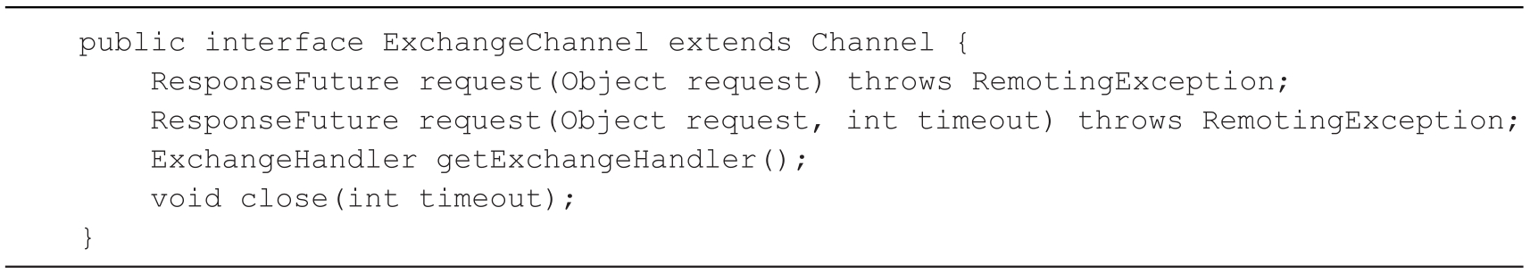 在类层关系上,ExchangeChannel接口又继承了Channel接口,在Channel接口的基础上扩展了请求响应模式的功能,并能获取绑定在通道上的网络事件监听器。Exchange-Channel接口定义如代码清单3-6所示。