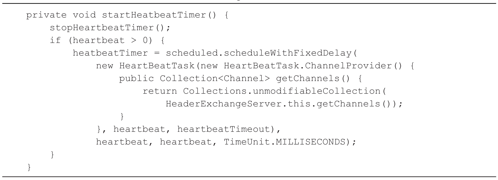 另外,在HeaderExchanger中创建的HeaderExchangeServer作为信息交换层服务器,将网络层的Channel扩展为交换层的ExchangeChannel,并加入心跳检测功能,如代码清单3-11所示。