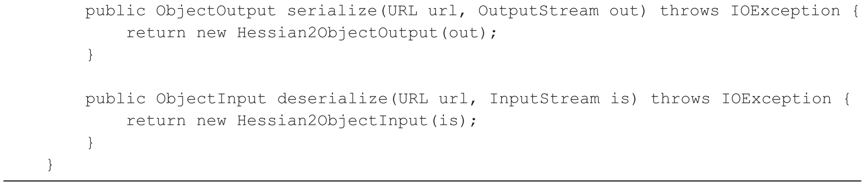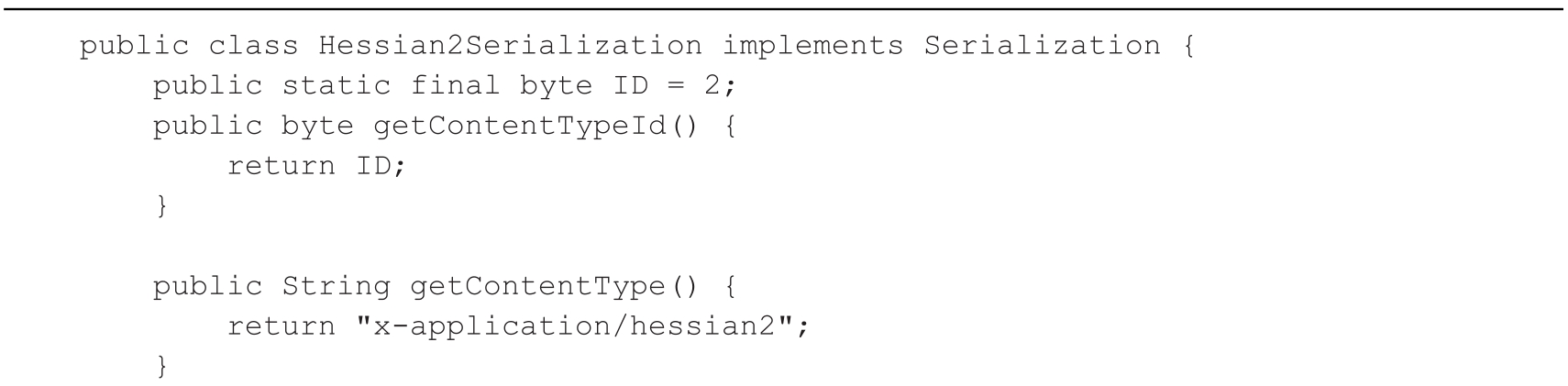 在Dubbo中,Hessian2Serialization实现了Serialization接口,我们就以Hessian2Seria-lization为例介绍具体的在Dubbo中实现序列化/反序列化的方法,Hessian2Serialization类定义如代码清单3-17所示。