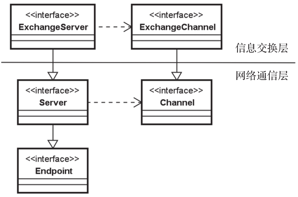 上述这组接口是理解Dubbo服务器端运行机制的基础,其中有些属于网络通信层,例如Endpoint和Server接口,而有些又属于信息交换层,例如ExchangeServer接口。它们之间的继承关系以及所处的层次如图3-3所示(这些接口都位于dubbo.remoting.api包中)。