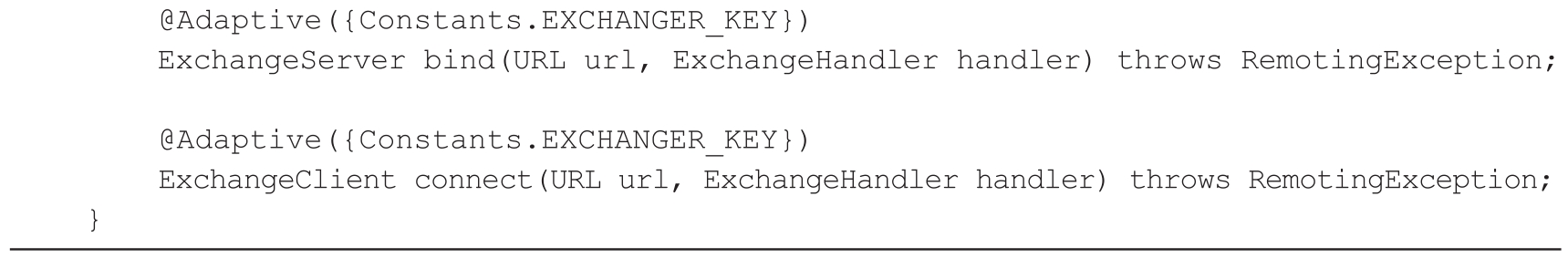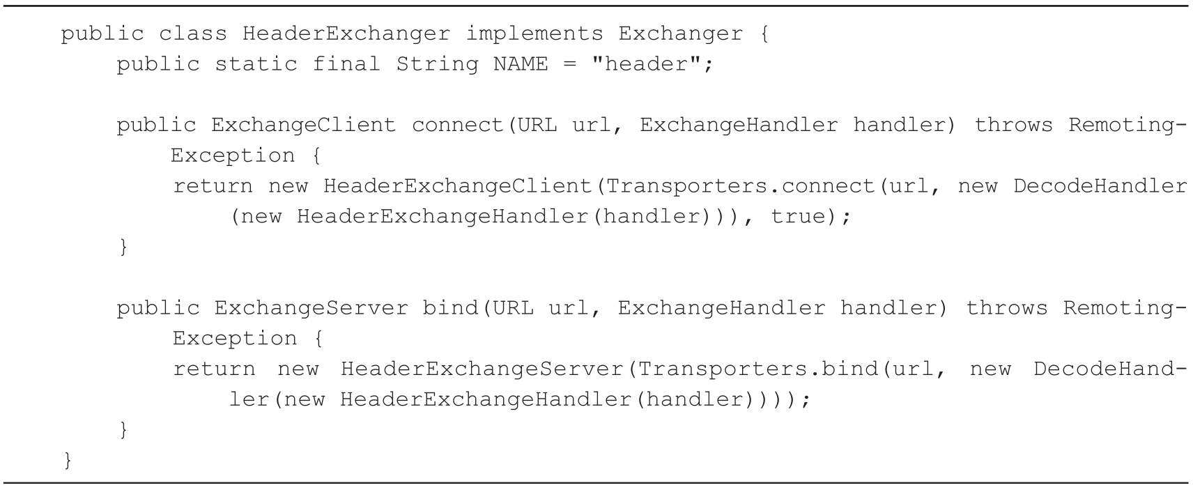 Exchanger接口只有两个方法,一个是面向服务器端的bind方法,另一个是面向客户端的connect方法。在Dubbo中,Exchanger的实现类只有一个,即HeaderExchanger,如代码清单3-10所示。