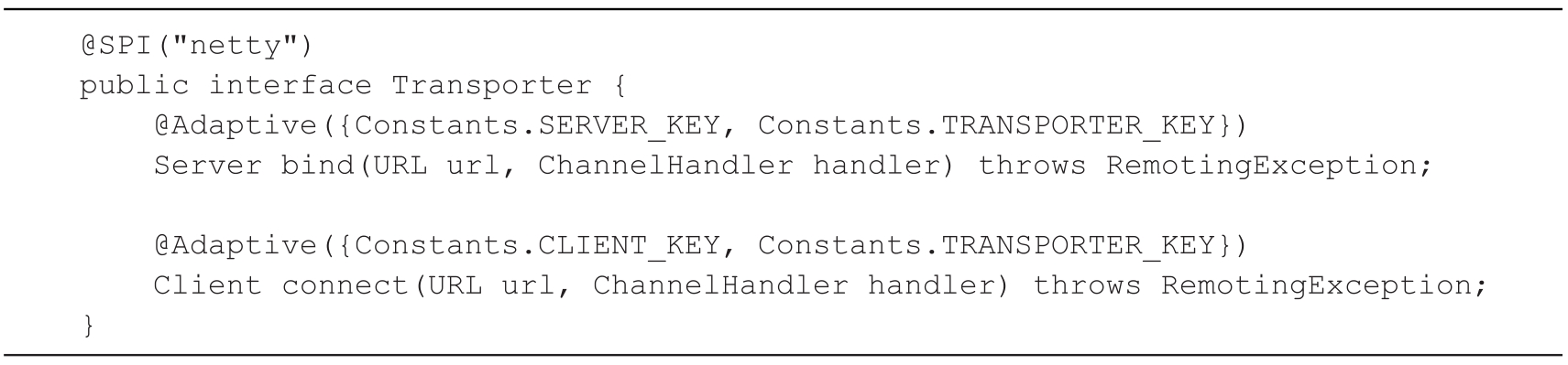站在服务器的角度,网络通信的目的就只有一个,即装配服务并启动监听,从而接收来自服务消费者的访问。而对于服务消费者而言,网络通信的目的无非是对远程服务进行连接、发送请求并获取响应。因此,在Dubbo的com.alibaba.dubbo.remoting包中存在一个Transporter接口,如代码清单3-12所示。