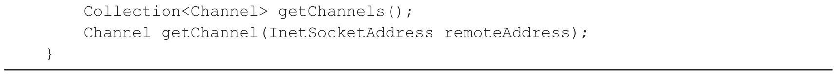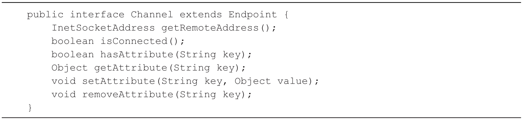 ExchangeServer在Server接口的基础上,将获取Channel的方法扩展为获取Exchange-Channel的方法。Channel接口同样继承了Endpoint接口,如代码清单3-5所示。