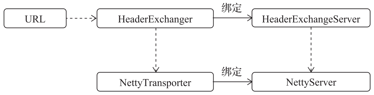 图3-2涉及了HeaderExchangeServer、HeaderExchanger、NettyTransporter和NettyServer等核心对象。显然,这些对象从命名上就可以很明确地被划分到Exchange和Transport这两个层。