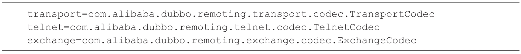 com.alibaba.dubbo.remoting.Codec2配置文件用来执行SPI机制,我们会在本书第16章中对此进行专项介绍,这里只需要明白Dubbo采用这种配置方式来动态加载运行时的类对象。在代码中,Dubbo对exchange和transport都提供了Codec支持。