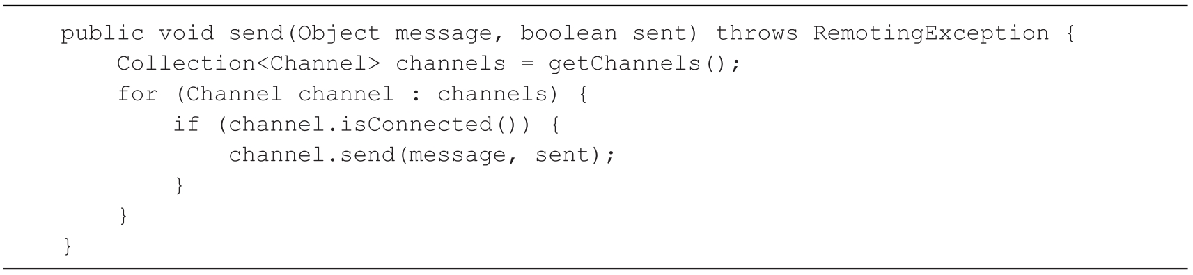 其中,真正实现网络通信的是NettyServer类,NettyServer实现了Server接口并扩展了AbstractServer类。在AbstractServer中,Dubbo提供了对网络服务端的通用抽象,即抽象出open、close、send等一组面向网络通信的通用流程。例如,AbstractServer的send方法如代码清单3-14所示,通过getChannels方法获取通道,然后遍历这些通道并调用Channel.send方法进行发送。