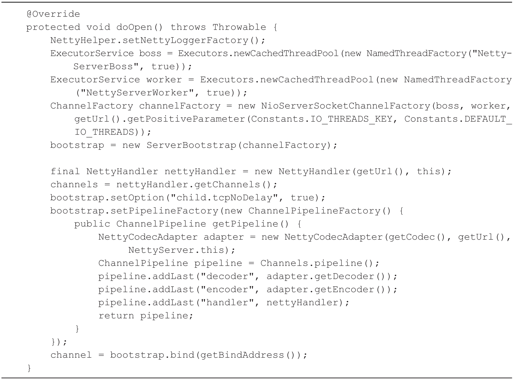 AbstractServer同时提供了doOpen和doClose这两个模板方法供子类进行实现。而NettyServer作为AbstractServer的子类,其doOpen方法如代码清单3-15所示。