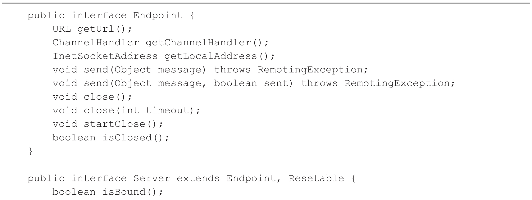 代码中出现了ExchangeServer接口,要想理解这个接口,首先得理解Dubbo中关于端点和服务器的抽象,分别定义Endpoint和Server接口,如代码清单3-3所示,其中Server接口继承了Endpoint接口。