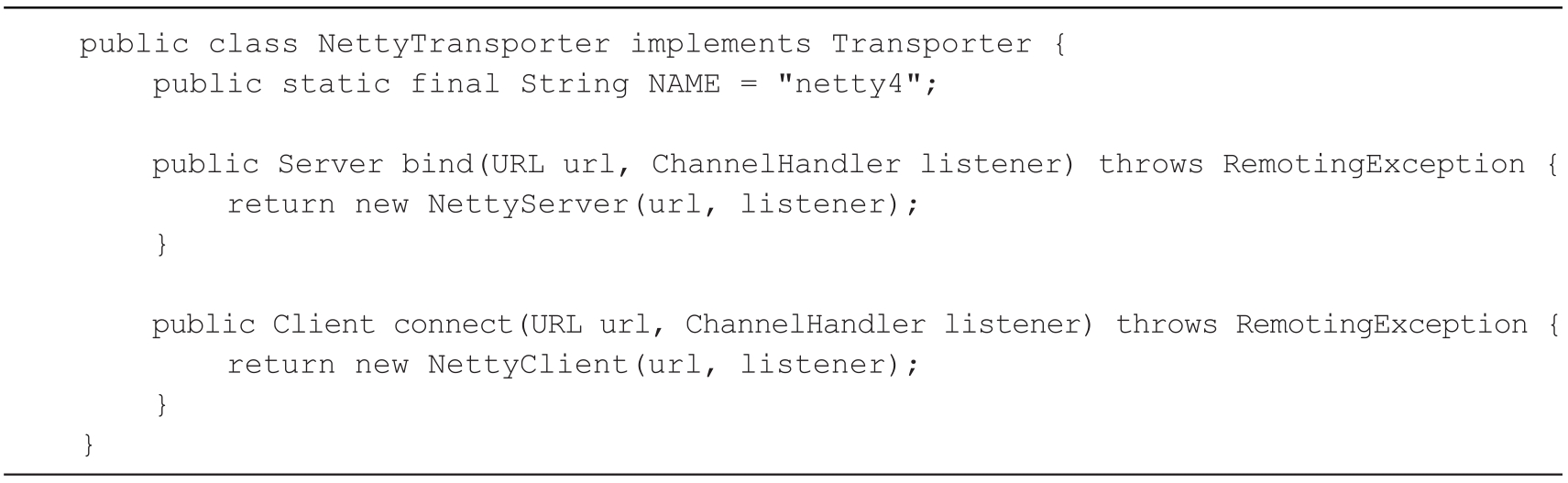 与HeaderExchanger不同,Dubbo针对Transporter接口提供了一批实现类,包括GrizzlyTransporter、MinaTransporter以及两个NettyTransporter。系统默认加载com.alibaba.dubbo.remoting.transport.netty包下的NettyTransporter,该类如代码清单3-13所示。