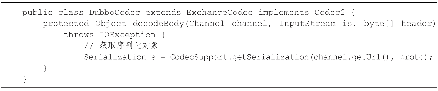 关于Dubbo序列化另外一个重点关注点是Codec2接口,该接口位于dubbo-remoting-api代码工程中,提供了对网络编解码的抽象,而编解码显然需要依赖Serialization接口作为其数据序列化的手段。我们可以通过代码清单3-19所示的代码片段来了解DubboCodec中decodeBody方法。