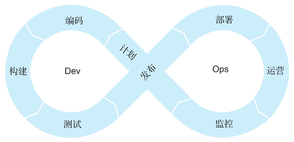 要实现上述目标,就要求DevOps在实践中能够提供一条跨职能的工作流,通过敏捷管理和持续集成、持续交付、持续部署不断应对需求变化来驱动软件的开发和上线运行。这种不断拥抱变化、持续改进的思想,无疑将会使软件开发与上线运行过程更加高效和敏捷。而在实践中,一般通过DevOps模型来描述上述跨职能工作流,以揭示DevOps驱动软件开发—运营的全过程。如图3-3所示,整个过程是从计划(需求分析和设计)、编码开始,然后持续集成(构建)、测试,再到软件发布和部署,并延伸到运营和监控,呈现“莫比乌斯环”形态,周而复始。
