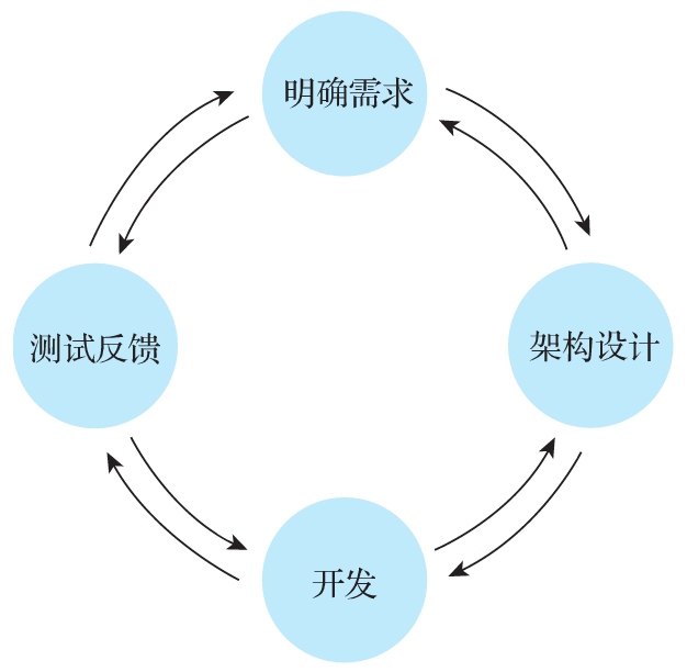总体来说,敏捷开发主要以用户需求为核心,以迭代更新、循序渐进的方式推进软件开发。然而,敏捷开发并没有针对软件开发过程规定一套确定的和普遍适用的具体流程。事实上,敏捷开发只是描述了一系列与之配套的软件开发价值和原则。正因为如此,敏捷开发才具有极大的灵活度。在为软件开发提供巨大灵活性的前提下,敏捷开发范畴下的各种软件开发方法遵循一套共同的迭代开发基本流程。而敏捷开发模型提供这样一个基本流程。在敏捷开发模型中,从明确需求到架构设计,从架构设计到开发,从开发到测试反馈,再在测试反馈基础上进一步明确需求,周期性循环执行,构成一套闭环的敏捷开发基本流程,如图3-2所示。