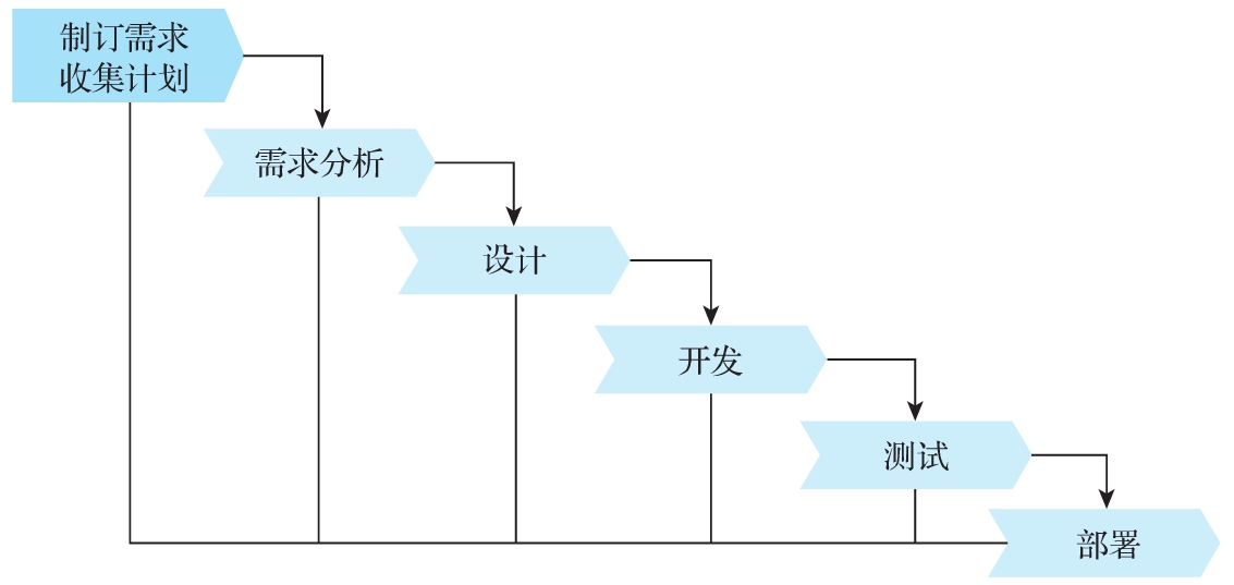 在瀑布模型中,软件生命周期被划分为6个基本阶段,分别为制订需求收集计划、需求分析、设计、开发、测试和部署阶段;每一个阶段自上而下地按顺序完成,不能跳跃,如图3-1所示。