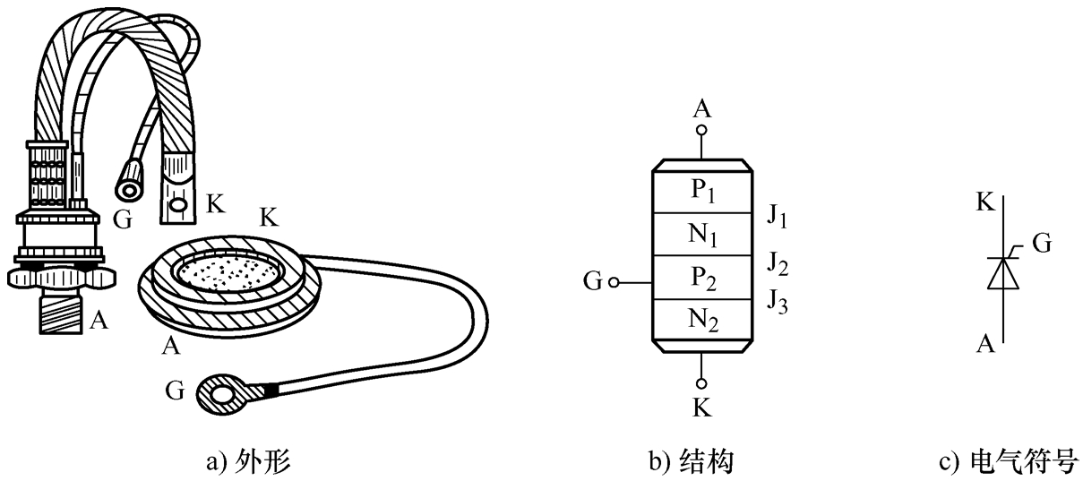 晶闸管是一种四层半导体三个PN结的三端大功率电力电子器件,其外形、结构和电气符号如图2-4所示。
