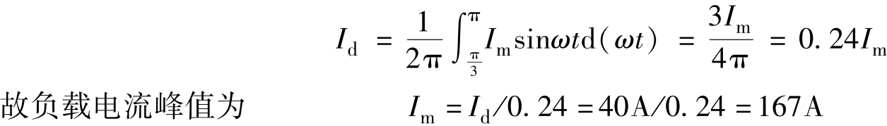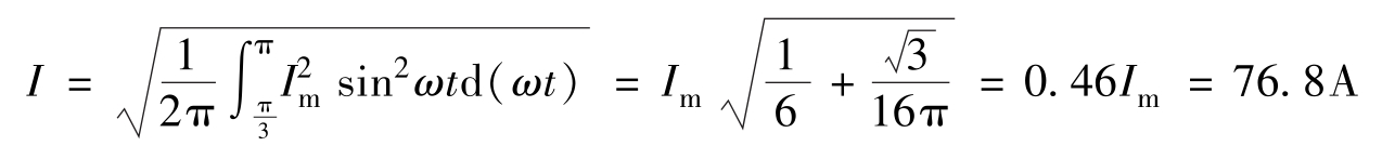 例2.1 在半波整流电路中,晶闸管从π/3时刻开始导通。负载电流平均值为40A,若取安全裕量为2,试选取晶闸管额定电流。