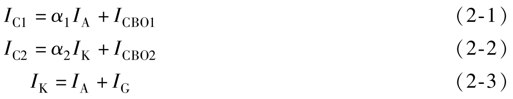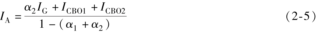 式中, α 1 和 α 2 分别是晶体管V 1 和V 2 的共基极电流放大倍数; I CBO1 和 I CBO2 分别是晶体管V 1 和V 2 的共基极漏电流。由式(2-1)~式(2-4)可得