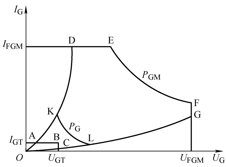 (2)晶闸管的门极伏安特性 晶闸管的门极触发电流是从门极流入晶闸管,从阴极流出的。阴极是晶闸管主电路与控制电路的公共端。门极触发电流也往往是通过触发电路在门极和阴极之间施加触发电压而产生的。从晶闸管的结构图可以看出,门极和阴极之间存在一个PN结J 3 ,其伏安特性称为门极伏安特性。门极伏安特性是指这个PN结上正向门极电压 U G 与门极电流 I G 间的关系。晶闸管门极伏安特性如图2-7所示。由于这个结的伏安特性有较大分散性,无法找到一条典型的代表曲线,只能用极限高阻门极特性和一条极限低阻门极特性之间的一个区域来代表所有器件的门极特性。在晶闸管的正常使用中,门极PN结不能承受过大的电压、过大的电流及过大的功率,这就是门极伏安特性区的上限,它分别用门极正向峰值电压 U FGM 、门极正向峰值电流 I FGM 、门极峰值功率 P GM 来表征。另外门极触发也有一个灵敏度问题,为了保证可靠、安全的触发,门极触发电路所提供的触发电压、触发电流和功率都应限制在晶闸管门极伏安特性曲线中的可靠触发区(为图中的AK-D-E-F-G-L-C-B-A区域)内,其中, U GT 为门极触发电压, I GT 为门极触发电流。