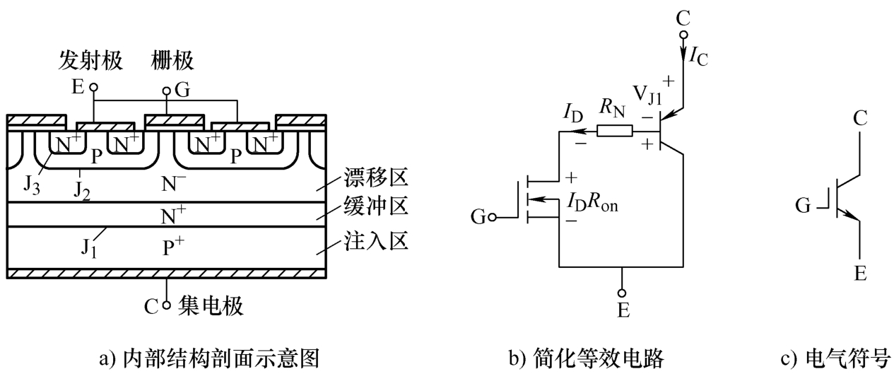 图2-24 IGBT的结构、简化等效电路和电气符号