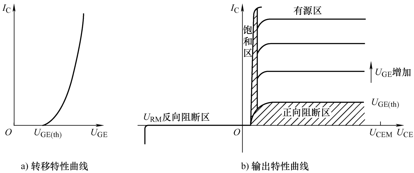 IGBT的静态特性主要包括转移特性和输出特性,如图2-25所示。图2-25a所示为IGBT的转移特性曲线,它描述的是集电极电流 I C (输出电流)与栅射电压(输入电压) U GE 之间的关系。与电力MOSFET的转移特性类似,开启电压 U GE(th) 是IGBT能实现电导调制而导通的最低栅射电压。栅射电压 U GE 小于开启电压 U GE(th) 时,IGBT处于关断状态。当栅射电压 U GE 接近开启电压 U GE(th) 时,集电极开始出现电流 I C ,但很小。当 U GE 大于 U GE(th) 时,在大部分范围内, I C 与 U GE 呈线性关系变化。由于 U GE 对 I C 有控制作用,所以最大栅极电压受最大集电极电流 I CM 的限制,其典型值一般为15V。图2-25b所示为IGBT的输出特性,也称为伏安特性,它描述的是以栅射电压 U GE 为参考变量时,集电极电流 I C (输出电流)与集射极间电压 U CE (输出电压)之间的关系。此特性与GTR的输出特性相似,不同之处是参变量,GTR为基极电流 I b ,而IGBT为栅射电压 U GE 。IGBT输出特性分为三个区域,即正向阻断区、有源区和饱和区。这分别与GTR的截止区、放大区和饱和区相对应。当 U CE <0时,器件呈现反向阻断特性,一般只流过微小的反向电流。在电力电子电路中,IGBT工作在开关状态,因此是在正向阻断区和饱和区之间交替转换。