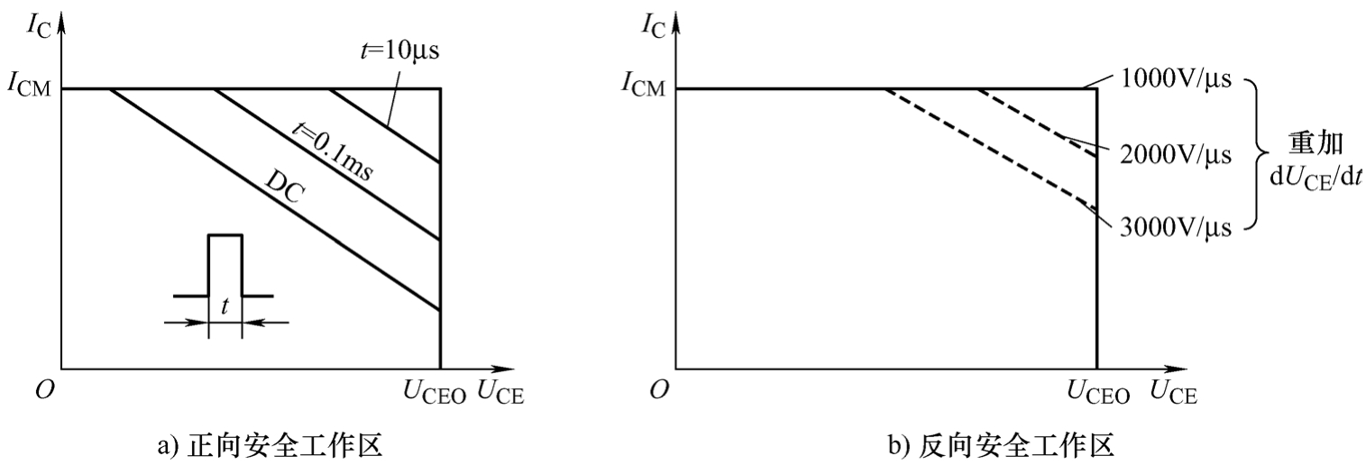IGBT导通和关断时,均具有较宽的安全工作区。根据最大集电极电流 I CM 、最大集射极间电压 U CEO 和最大集电极功耗可以确定IGBT在导通工作状态的参数极限范围,即正向偏置安全工作区(Forward Biased Safe Operating Area,FBSOA)。如图2-27a所示,正向偏置安全工作区与IGBT的导通时间密切相关,它随导通时间的增加而逐渐减小,直流工作时安全工作区最小。