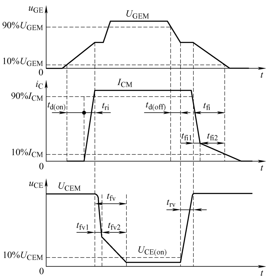 在IGBT开通时,集射电压下降的过程是首先IGBT中的MOSFET单独工作的电压下降过程,在这段时间内栅极电压 u GE 维持不变,这段时间称为电压下降第一段时间 t fv1 。在MOSFET电压下降时,致使IGBT中的PNP晶体管也有一个电压下降过程,此段时间称为电压下降第二段时间 t fv2 。由于 u CE 下降时,IGBT中MOSFET的栅漏极电容增大,并且IGBT中的PNP晶体管需由放大状态转移到饱和状态,因此 t fv2 时间较长。只有在 t fv2 段结束时,IGBT才完全进入饱和状态。导通时间 t on 可以定义为开通延迟时间与电流上升时间及电压下降时间之和。