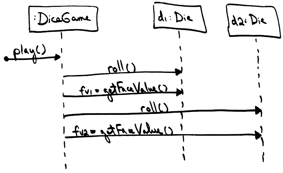 例如,图1-4中的顺序图描述了骰子游戏的OO软件设计,即给DiceGame和Die类的实例发送消息。该图是白板上的草图,这是现实世界中使用UML的常见方式。