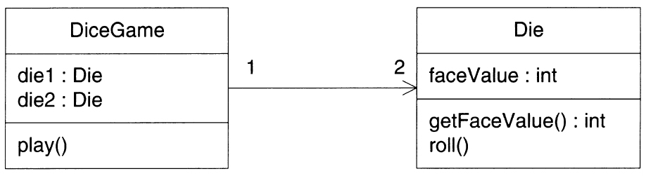 例如,在骰子游戏中,通过观察顺序图可以导出图1-5所示的局部设计类图。因为向DiceGame对象发送了play消息,所以DiceGame类需要play方法;同理,Die类需要roll和getFaceValue方法。