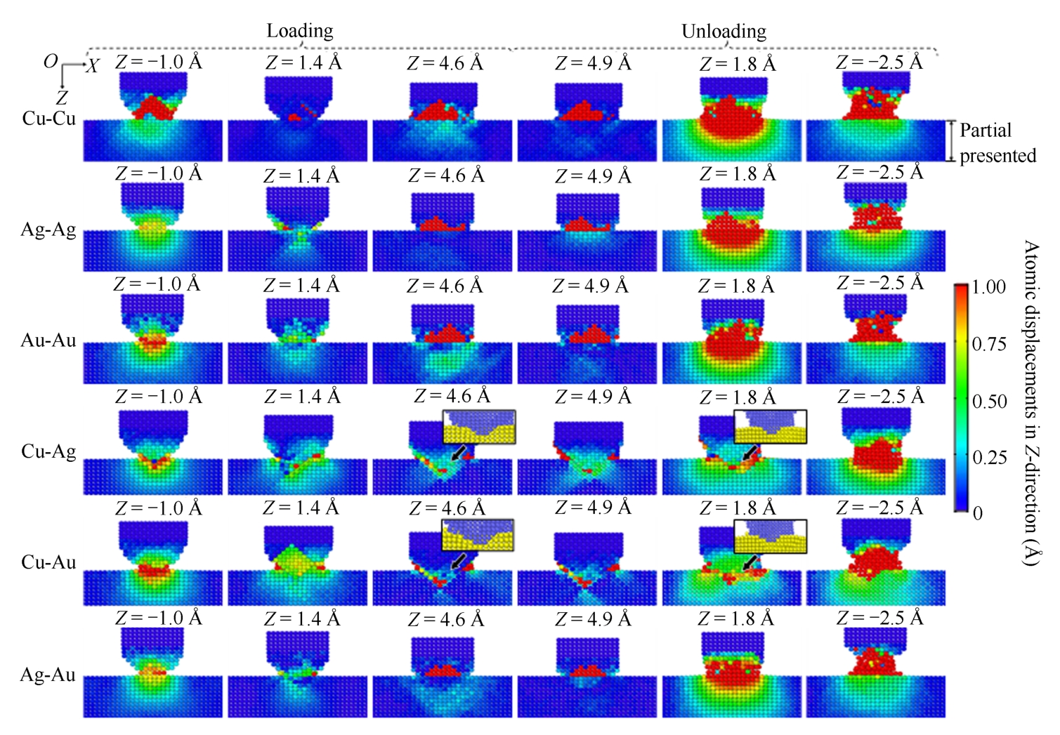 During the unloading process (Fig. 2-4), with the wire moving upward from 4.9 Å to 1.8 Å (the Z -coordinate of wire), the force between the wire and substrate shifts from repulsive to attractive (Fig. 2-2), the wire and substrate tensile each other, so the atomic displacement of the wire and substrate increases in all material pairs. When the Z -coordinate of wire reaches 1.8 Å, as shown in the fifth column of Fig. 2-4, red color occurs in both the wire and substrate, except for Cu-Ag and Cu-Au pairs. For Cu-Ag and Cu-Au pairs, red color occurs near the interface of the wire and substrate (the interface is shown in partial enlarged figures). With further moving upward of the wire, when the Z -coordinate of wire reaches-2.5 Å, as shown in the sixth column of Fig. 2-4, neckbands form between the wire and substrate in all material pairs and their central areas present red color.