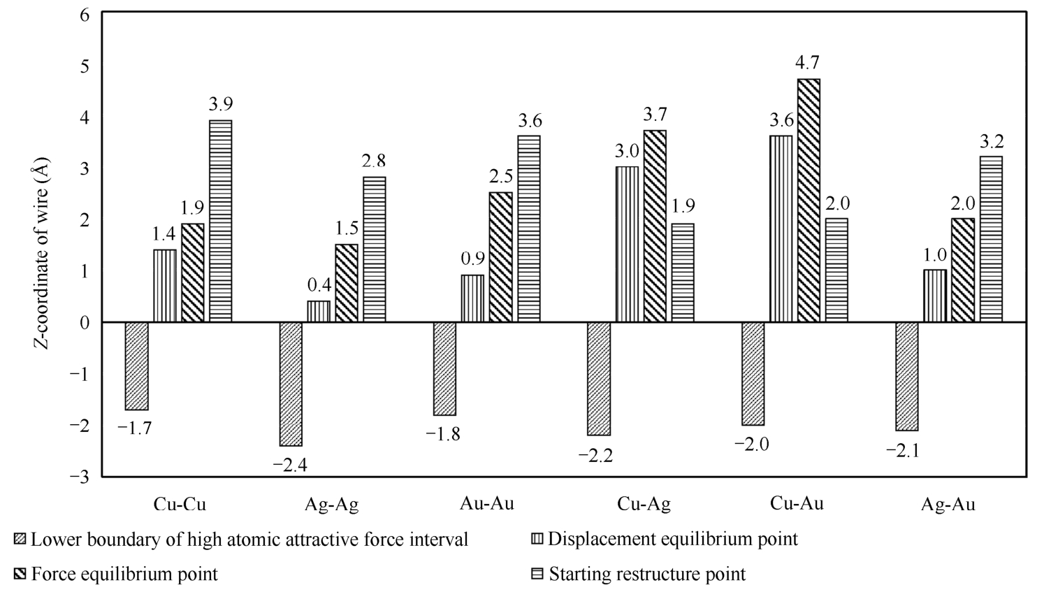Fig. 2-7 shows the Z -coordinate of wire corresponding to the lower boundary of high attractive force interval, displacement equilibrium points, force equilibrium points, and starting restructure points of the six material pairs during the loading process.