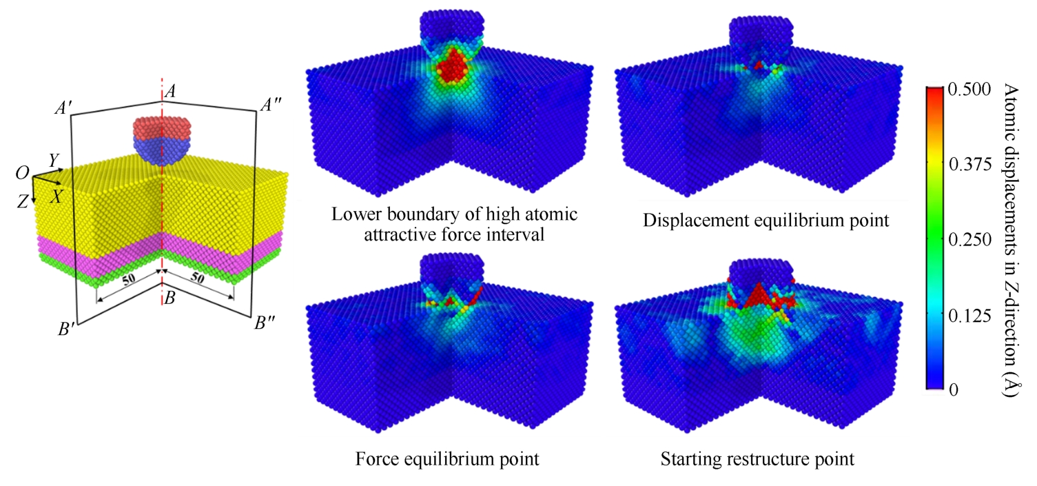 (2) Displacement equilibrium point. It occurs when atomic displacements of the wire and substrate in the central contact area along the Z -direction equal almost 0 Å during the loading process.