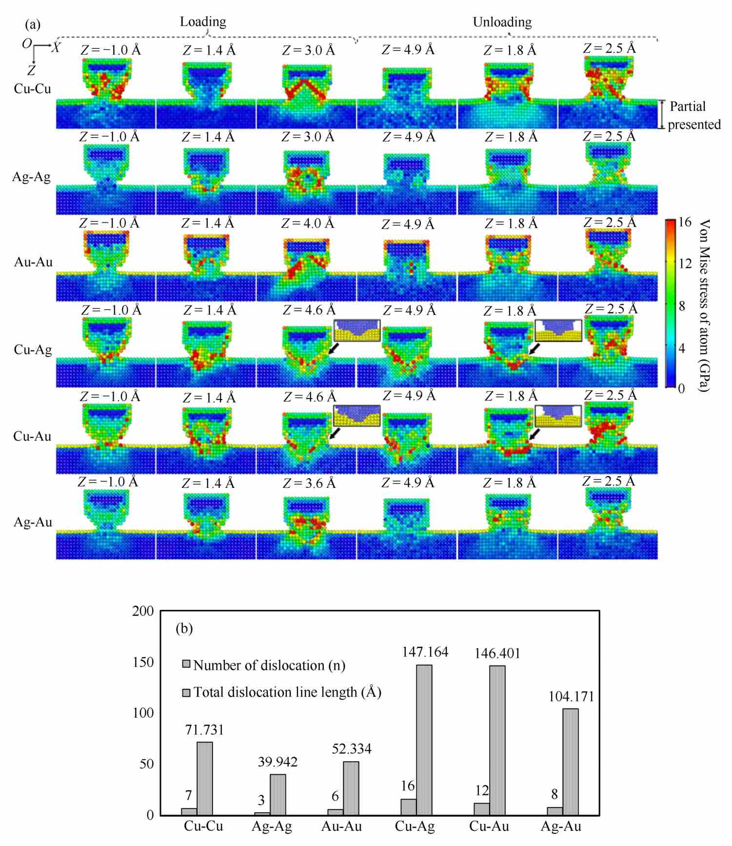 During the loading process, when the Z -coordinate of wire reaches approximately-1.0 Å, atomic contact between atoms of the wire and substrate has just recently occurred in six pairs, as shown in the first column of Fig. 2-5(a). Among six pairs, Cu-Cu pair has the largest count of atoms with the largest von Mise stress and Ag-Ag has the smallest. For Cu-Ag and Cu-Au pairs, red color occurs near the interface of the wire and substrate. Then, due to further moving downward of the wire, the wire and substrate compress each other. In Cu-Cu pair, the stress of atoms in the central area of wire decreases, as shown in the second column of Fig. 2-5(a). It is because that the wire and substrate shift from expanding to shrinking, and atoms shift from being attracted to compressed. But in Cu-Ag and Cu-Au pairs, the stress of atoms is still large. After that, as shown in the third column of Fig. 2-5(a), red color occurs almost in wires except for Cu-Ag and Cu-Au pairs. But for Cu-Ag and Cu-Au pairs, red color mainly occurs near the interface of the wire and substrate (the interface is shown in partial enlarged figures), and the profiles of the interface between the wire and substrate present a V-shape curve.