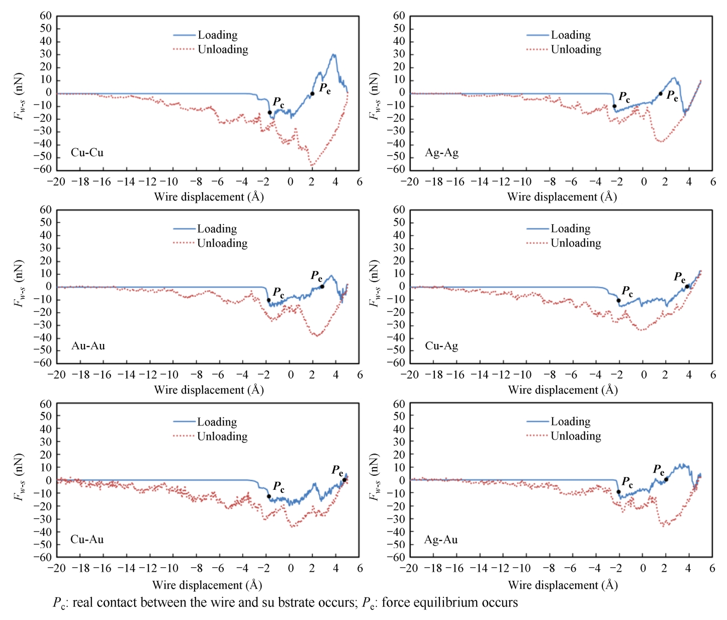The total atomic force of all the atoms between the wire and substrate is F w-s . The micro-scale contact process consists of loading and unloading processes. During the loading process, as shown in Fig. 2-2, F w-s performs attraction with the moving downward of the wire part during the loading process. With the further moving of the wire part, the value of F w-s increases and some atoms of both the wire and substrate come out. At a specific point ( P c point), atomic contact between atoms of the wire and substrate occurs. These specific points for all pairs occur before real contact of the wire and substrate (0 Å distance), and ranked in order of largest to smallest displacement of the wire as Ag-Ag>Cu-Ag>Ag-Au>Cu-Au>Au-Au>Cu-Cu, although the displacement difference is not obvious. Then, due to further moving downward of the wire, the wire and substrate are physically contacted and compressed each other, and for the compressed atoms between the wire and substrate, a repulsive force appears and increases with the displacement of wire in Z -direction. That is, the total attractive force reduces but the total repulsive force increases gradually. At a specific point, F w-s equals 0. The total force equilibrium point ( P e point) is defined as Z -coordinate of wire when F w-s equals 0. P e appears at around 2.0 Å, except for Cu-Ag and Cu-Au pairs. As the further moving downward of the wire, F w-s then shifts to repulsive and increases. As for Cu-Ag and Cu-Au, the plastic deformation appears in the Ag and Au substrates due to the larger hardness of Cu wire, and the total atomic forces (repulsive) are smaller than other four pairs. As the further moving downward of the wire, the repulsive force increases then dramatically decreases after reaching the material's limit of yielding only in Cu-Cu, Ag-Ag, Au-Au, and Ag-Au pairs, and yielding of the wires occurs when the Z -coordinate of wire reach approximately 3.9 Å, 2.8 Å, 3.6 Å, and 3.3 Å, respectively. After yielding occurs, the restructure of lattice starts and plastic deformation occurs.