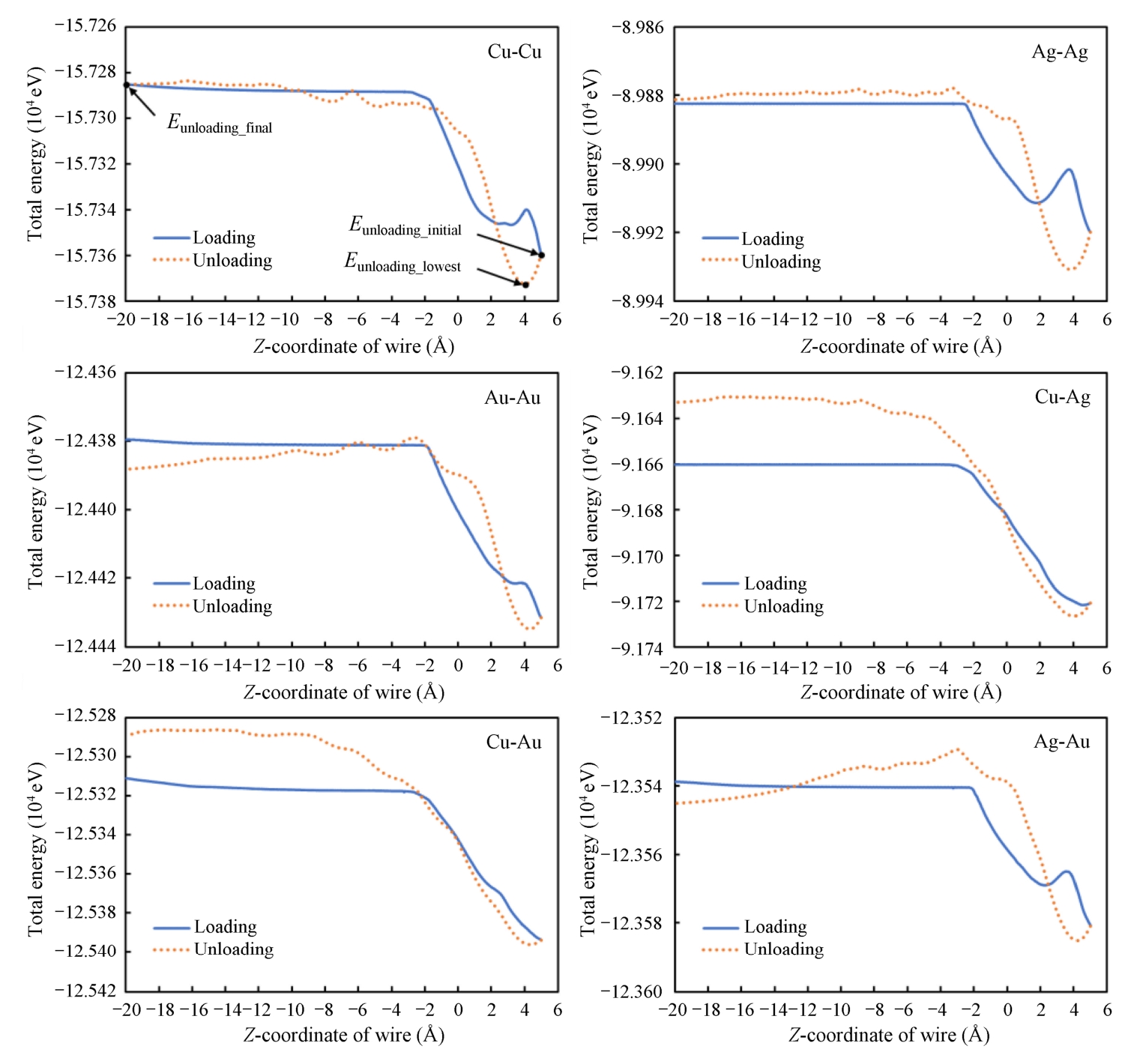 During the loading process, the total energy first remains unchanged. Then, the total energy decreases because of the reduction of potential energy caused by the approaching of the wire and substrate. As the wire further moving downward, the total energy turns to increase, but only for a short time before second decreasing for Cu-Cu, Ag-Ag, and Au-Ag pairs, but there are no second decreasing for other pairs. The corresponding sharp jumping of the trend indicates wire/substrate materials reaching their yielding points, which leads to a continuous decrease of their potential energies. But for Cu-Ag and Cu-Au pairs, only soft materials (Ag and Au) yield and deform plastically, so that the sharp jumping of the trend is not obvious.