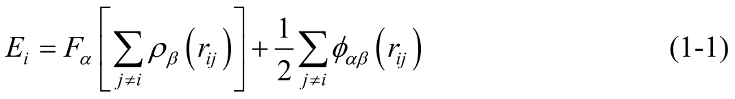 where F is the embedding energy, which is a function of the atomic electron density ρ ; ϕ is a pair potential interaction; α and β are the element types of i and j atoms. Both sums in the formula are over all neighbors of atom i within the cutoff distance.